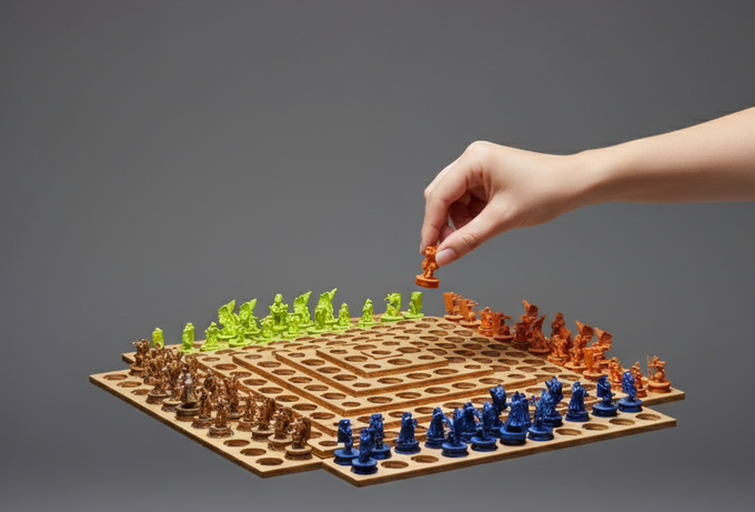 King of the Hill can be played with 2, 3, or 4 players. Each player takes one side of the board, assembling their army in any configuration across 22 tiles (see the red regions in the image below). However, the king MUST sit on the middle diamond tile (see the orange diamonds in the image below).